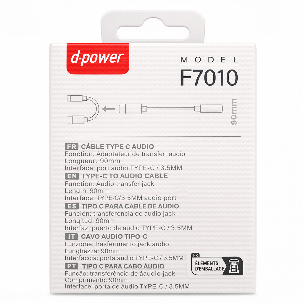 L’adaptateur USB-C vers jack 3.5 mm d-power F7010 permet de connecter facilement vos écouteurs ou votre casque audio équipé d’une prise jack 3.5 mm à un smartphone, une tablette ou tout appareil doté d’un port USB-C.